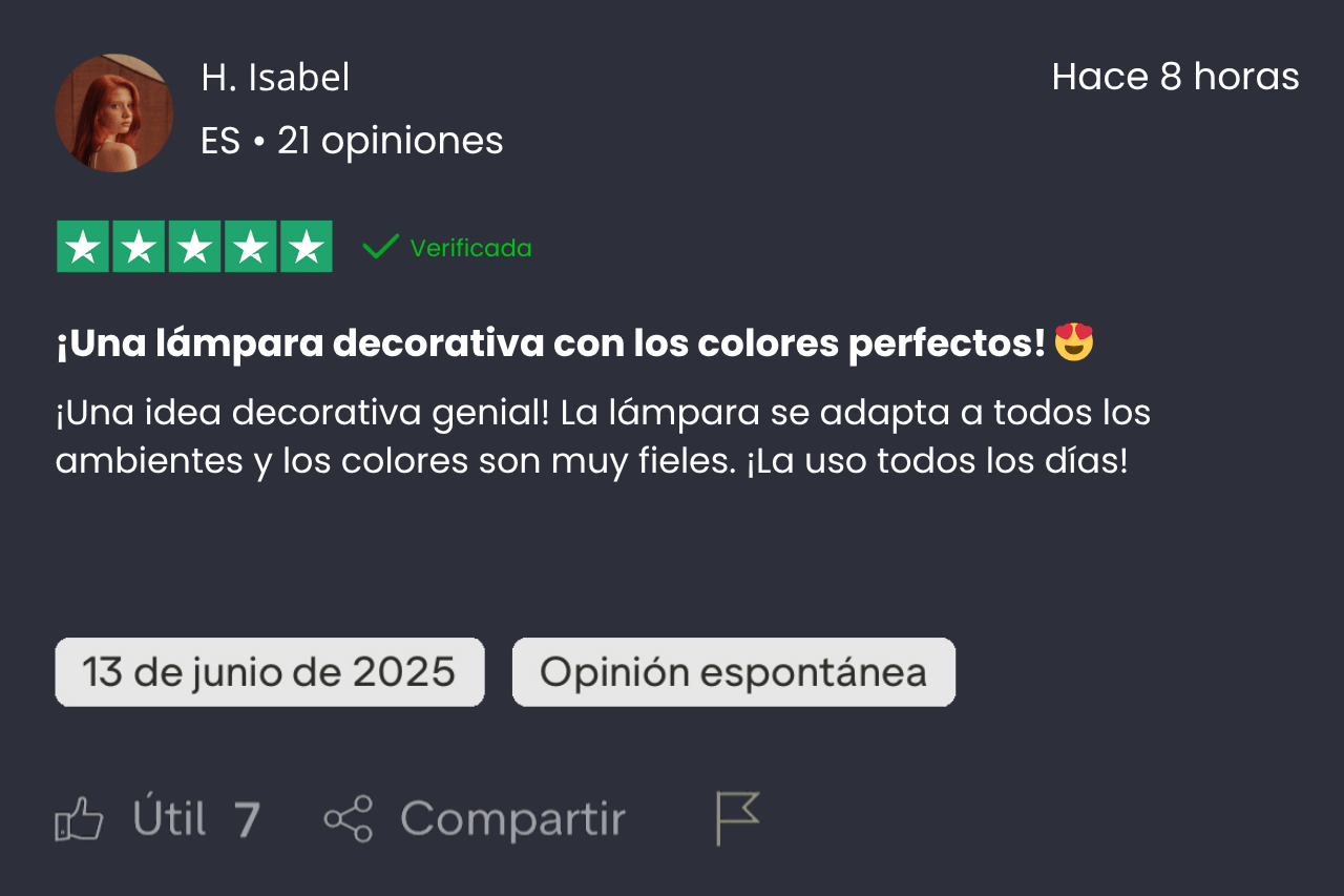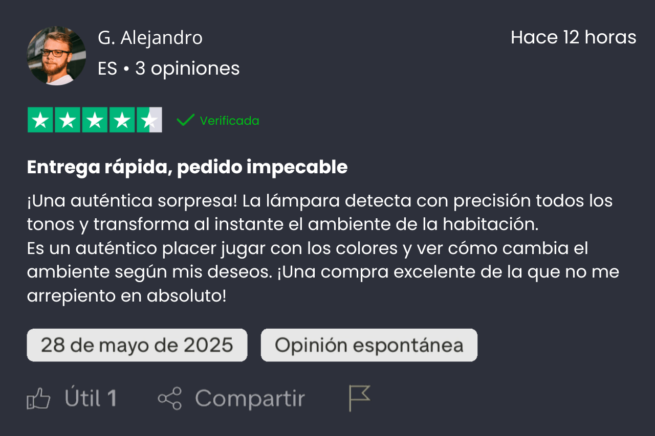El envío de tu lámpara ColorUp es gratuito y con seguimiento, realizado por nuestros proveedores de confianza, con un enlace para seguir tu pedido en tiempo real. Si cambias de opinión, dispones de 14 días para devolver el producto sin justificación, y te reembolsaremos el importe íntegro una vez lo hayamos recibido en perfecto estado.