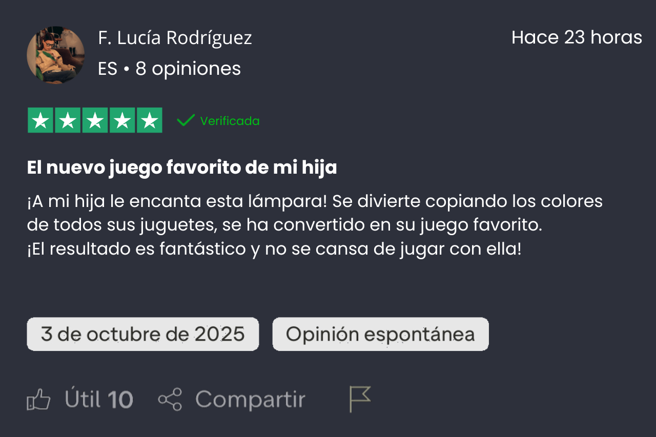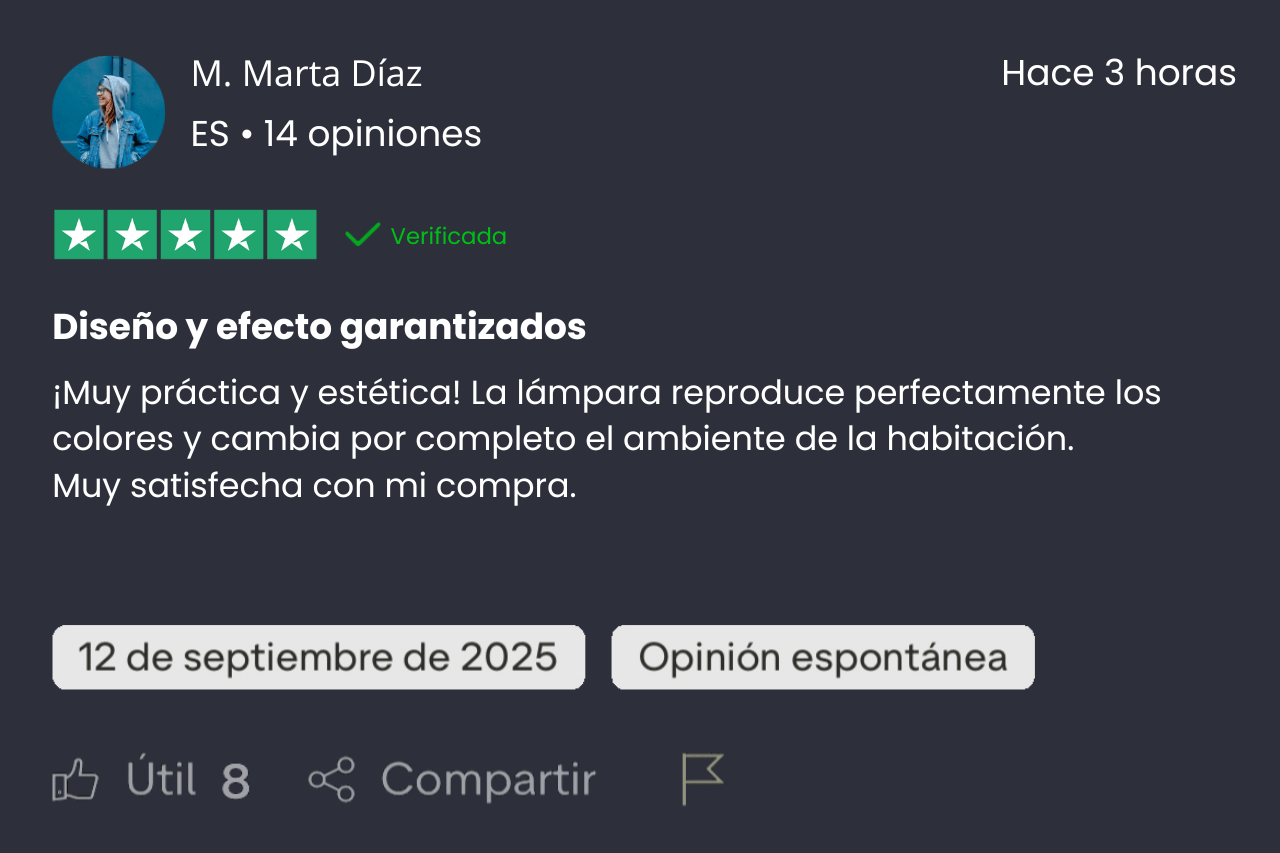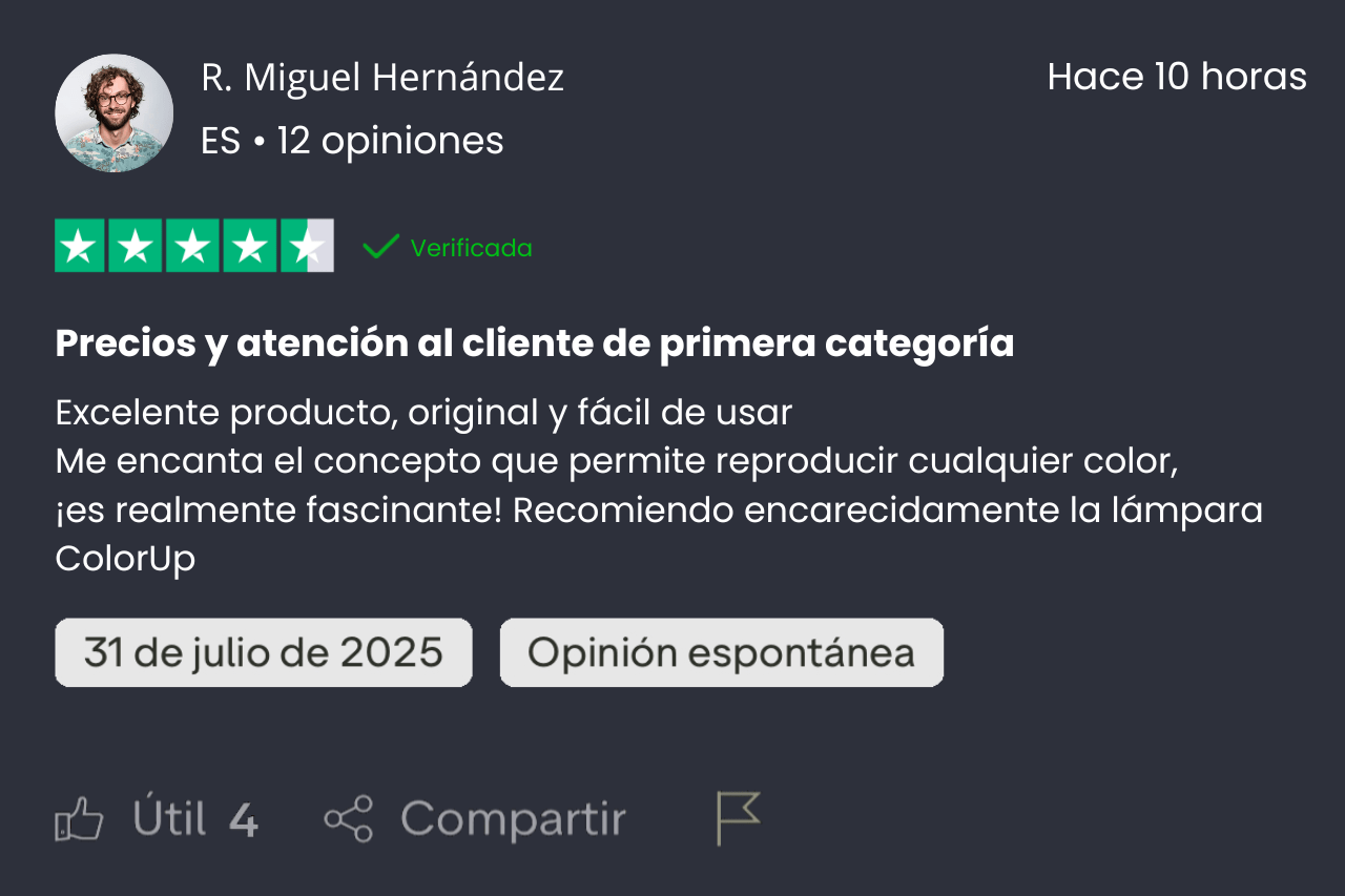 El envío de tu lámpara ColorUp es gratuito y con seguimiento, realizado por nuestros proveedores de confianza, con un enlace para seguir tu pedido en tiempo real. Si cambias de opinión, dispones de 14 días para devolver el producto sin justificación, y te reembolsaremos el importe íntegro una vez lo hayamos recibido en perfecto estado.